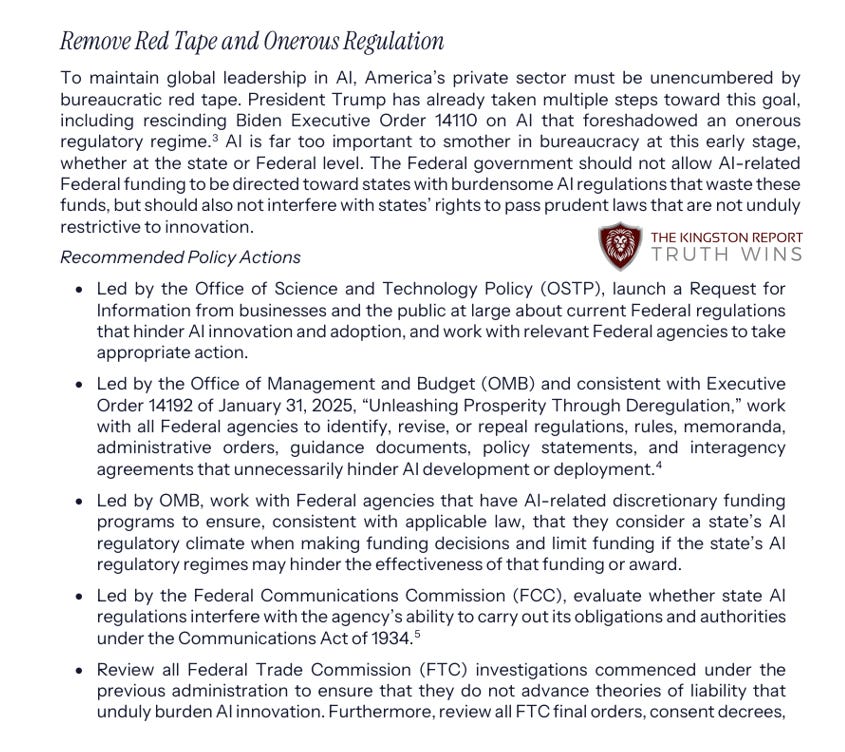 The plan is calling for the US federal government to strip US states of any legal powers related to Ai technology and to integrate the Broligarchs’ Ai in US and global corporations and federal agencies across all major US industries, including healthcare, biopharma (FDA), finance, energy, agriculture, et. al.