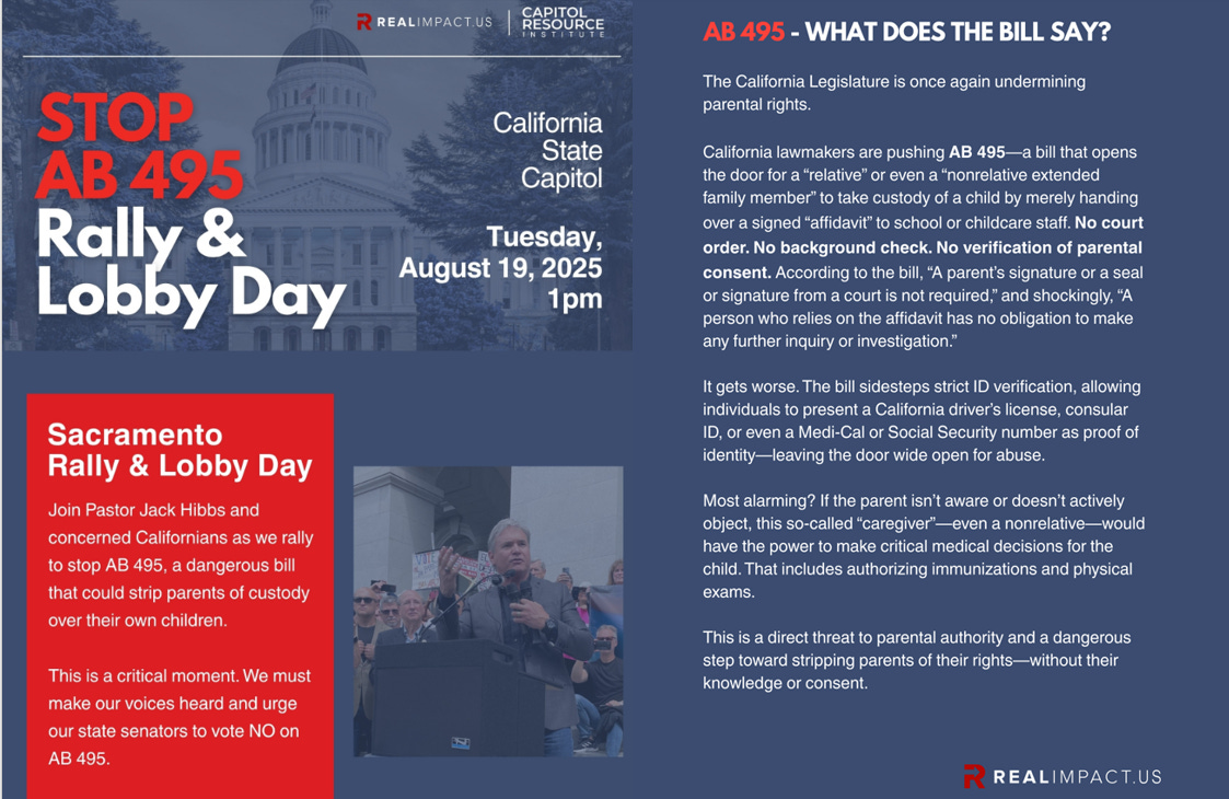 August 5, 2025: After posting this article yesterday - CA Assembly Bill (AB) 495: Granting Strangers Guardianship Over Schoolchildren - some local Kingston Report subscribers reached out to me to let me know that Pastor Jack Hibbs is organizing a rally on August 19th to protest California AB 495. (Thank you Pastor Hibbs).