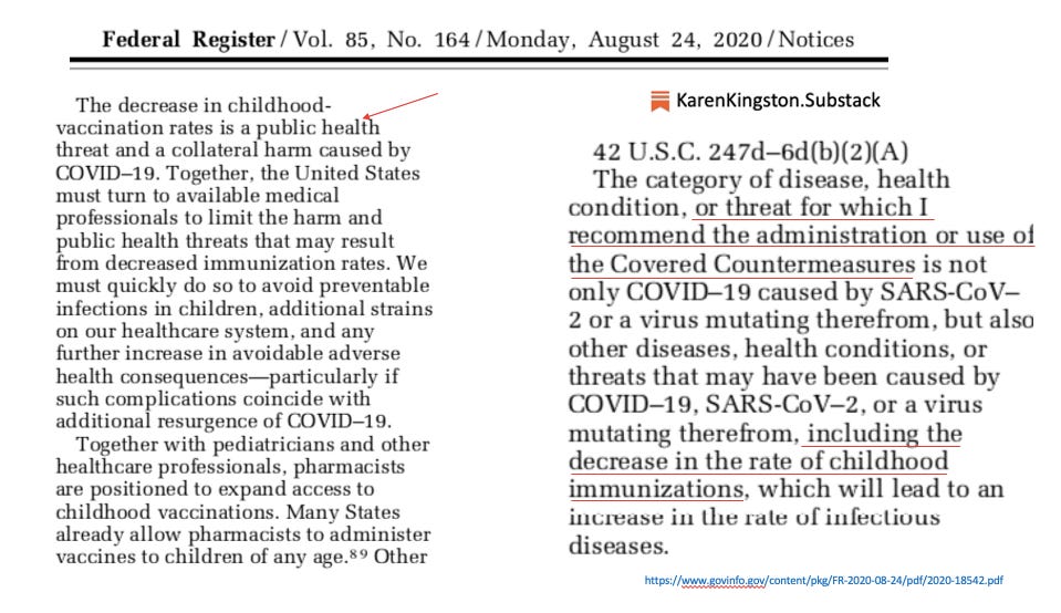 In this amendment, Azar states that ACIP (Advisory Committee Immunization Practices) vaccines, ALL vaccines are categorized as emergency use authorized (EUA) countermeasures, including childhood vaccines, as of August 24, 2020, code of federal regulations.