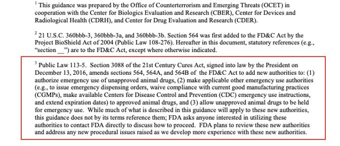 The PREP waiver for all vaccines includes the legal allowance for; authorizing emergency use of unapproved animal drugs, waiving compliance with current good manufacturing practices, extending expiration dates, and allowing for unapproved animal drugs to be held for emergency use (in humans).