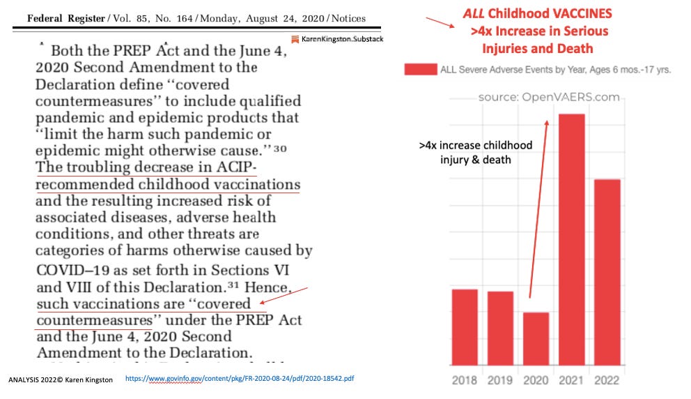 By declaring all childhood and adult vaccines as medical counter measures, Secretary Azar waived all safety, efficacy and manufacturing standards for all vaccine manufacturers under the Food & Drug Consumer Protection Act, as well as all waiving liability for manufacturers and ‘covered persons’ (i.e. doctors and pediatricians)