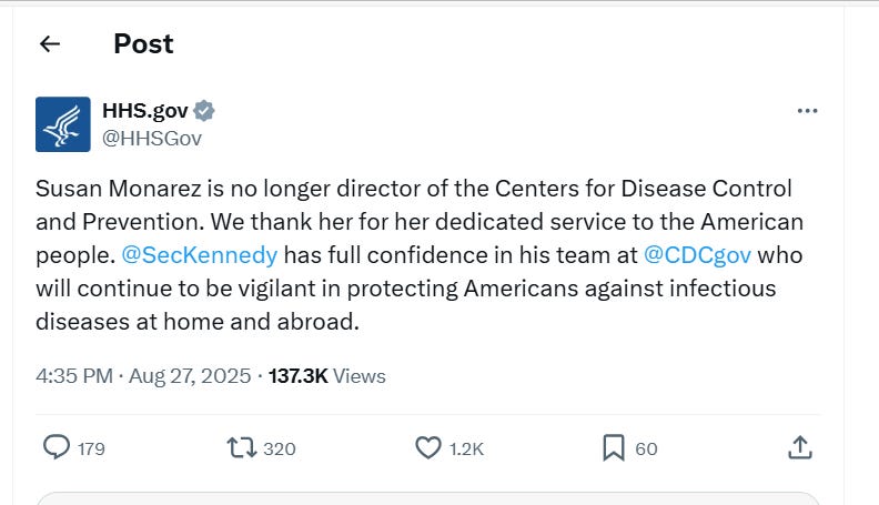 STAT News, The Washington Post and other media outlets reported that Susan Monarez was ousted (aka ‘fired’) after just 27 days on the job.