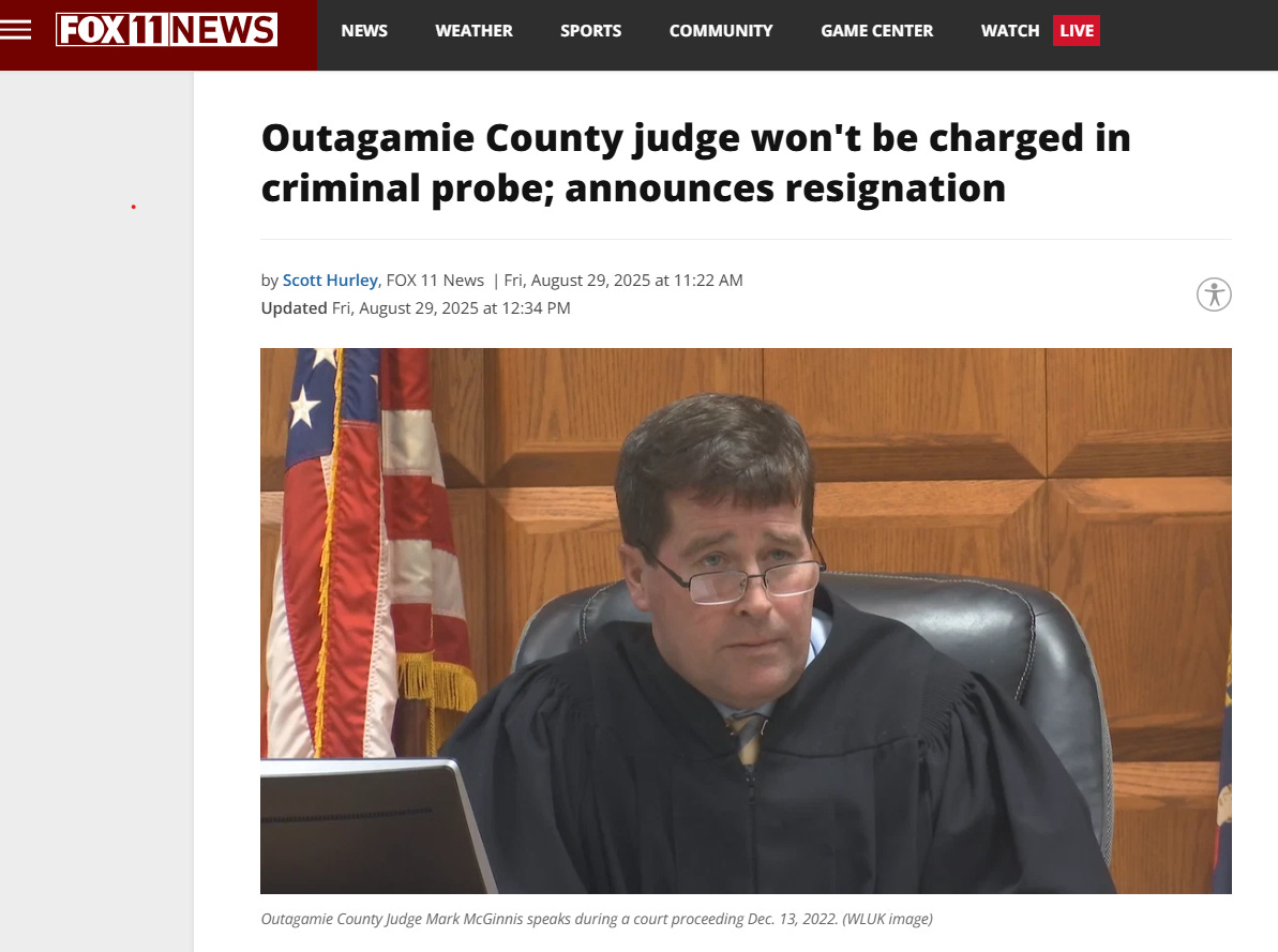 On August 28, 2025, the Wisconsin newspaper the Post-Crescent printed an unfavorable article regarding a criminal investigation into Judge McGinnis for unlawfully sentencing a cement contractor to prison for an alleged civil case of a breach of contract.