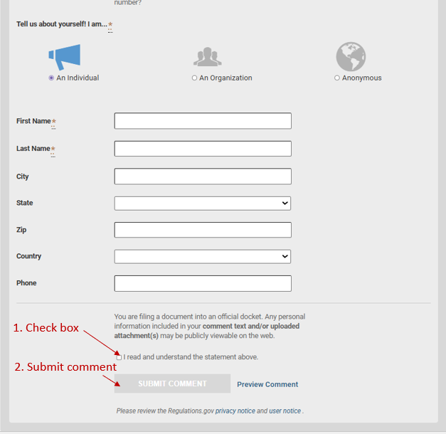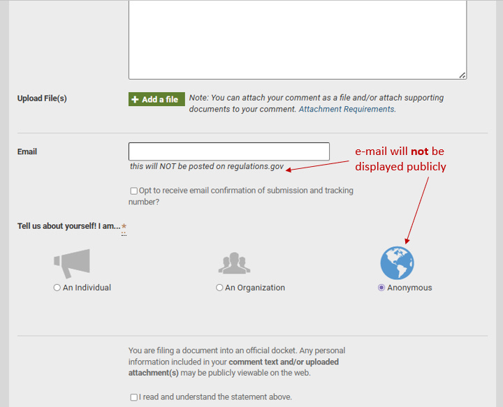 *You can remain anonymous and still receive a copy of your comment by simply entering your email address and checking the box to receive a copy of your comment.