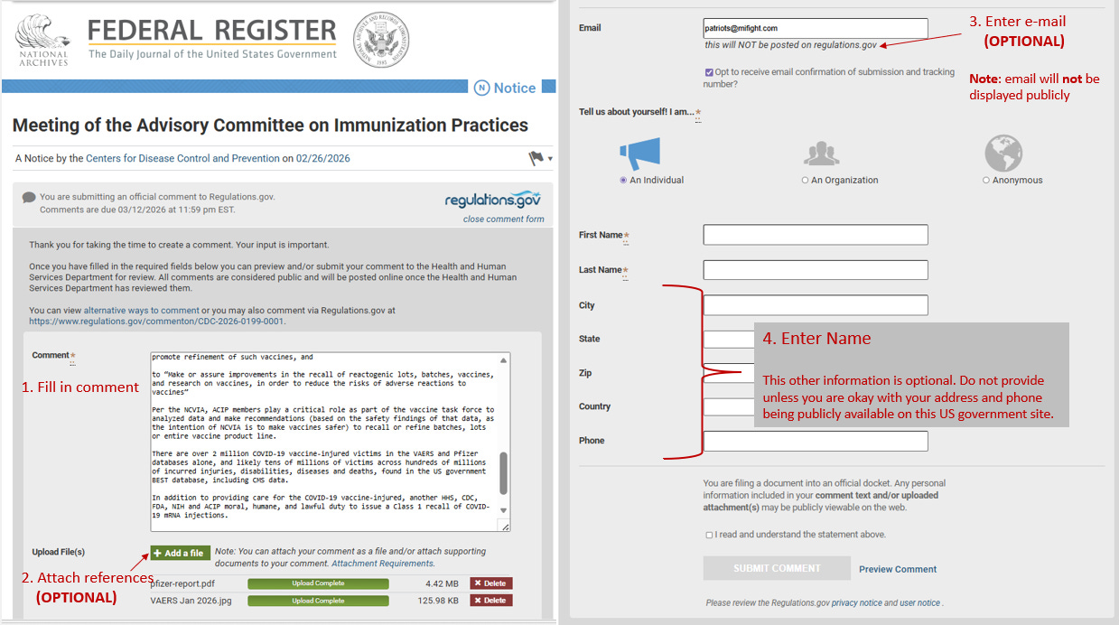 Please submit your honest, compassionate and respectful statements and requests to recall the COVID-19 mRNA-injections to ACIP by Thursday March 12, 2026.