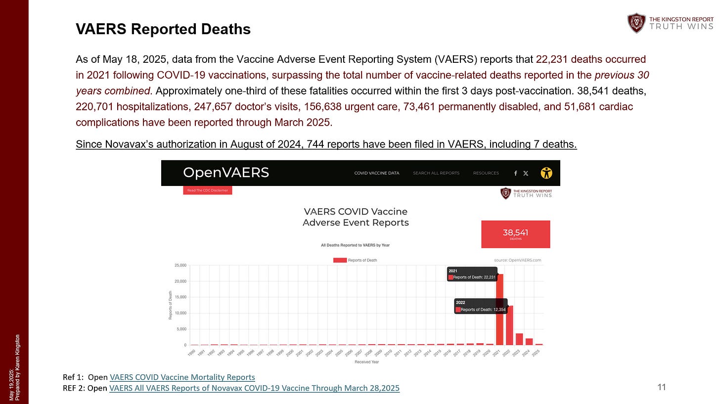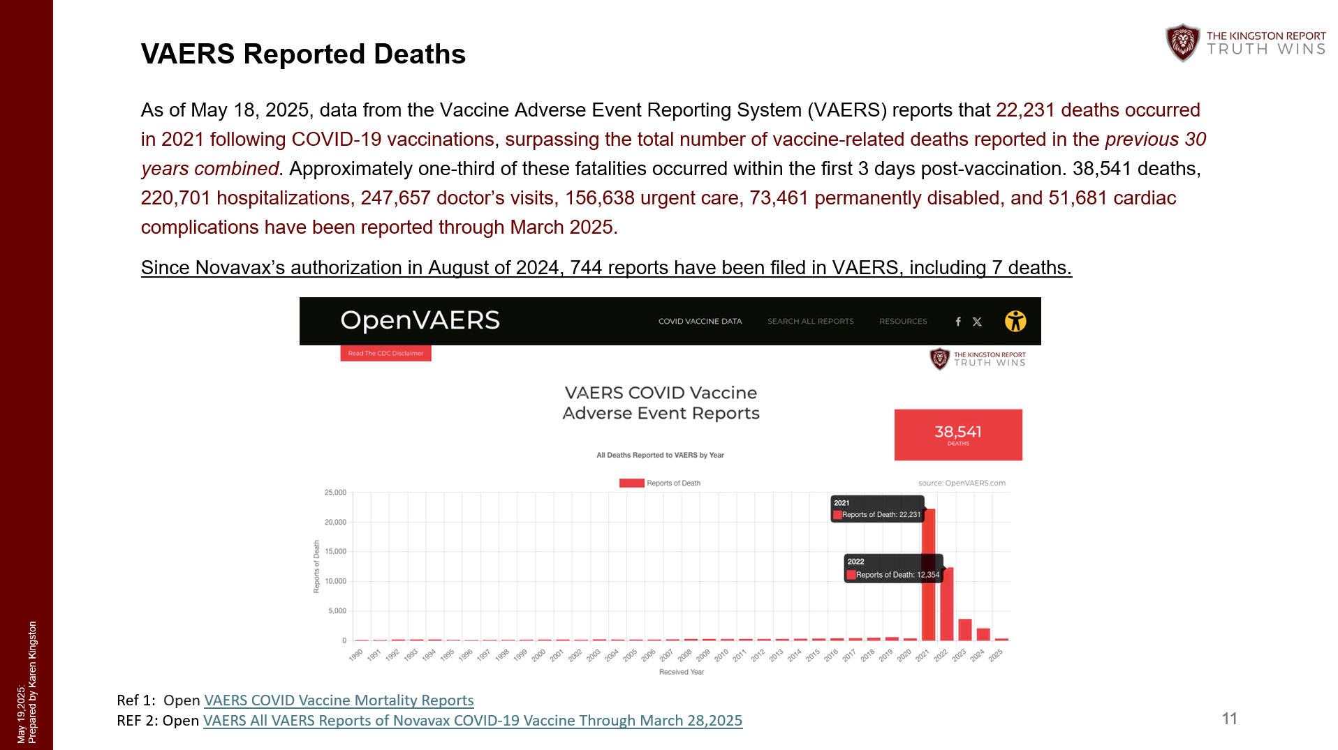 As of May 18, 2025, data from the Vaccine Adverse Event Reporting System (VAERS) reports that 22,231 deaths occurred in 2021 following COVID-19 vaccinations, surpassing the total number of vaccine-related deaths reported in the previous 30 years combined.
