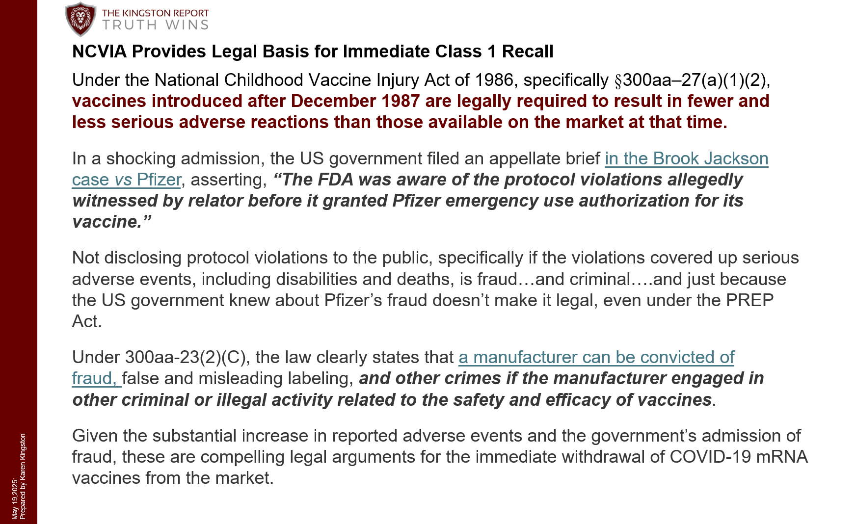 Given the substantial increase in reported adverse events and the government’s admission of fraud, these are compelling legal arguments for the immediate withdrawal of COVID-19 mRNA vaccines from the market.