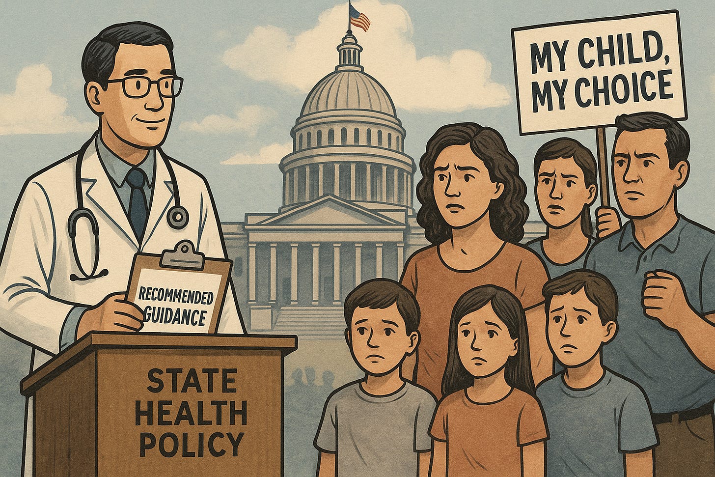 July 28, 2025: Apparently, pediatricians across America are greatly frustrated that only five (5) states (CA, CT, ME, NY, and WV) have laws that do not allow for religious exemptions for childhood vaccines. They would prefer if all 50 states did the same.