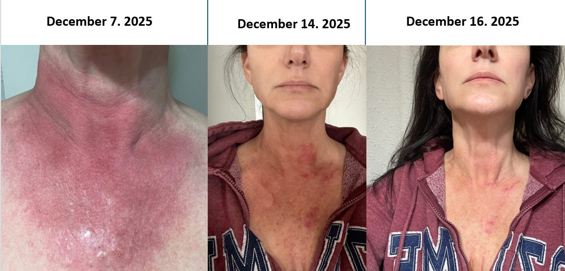 Right after Thanksgiving, my neck and chest plate felt like it was burning from the inside out (see December 7 image below). I had other symptoms of exhaustion, pain, and nausea from the pathogens in my body, which were consuming the majority of my time and energy.